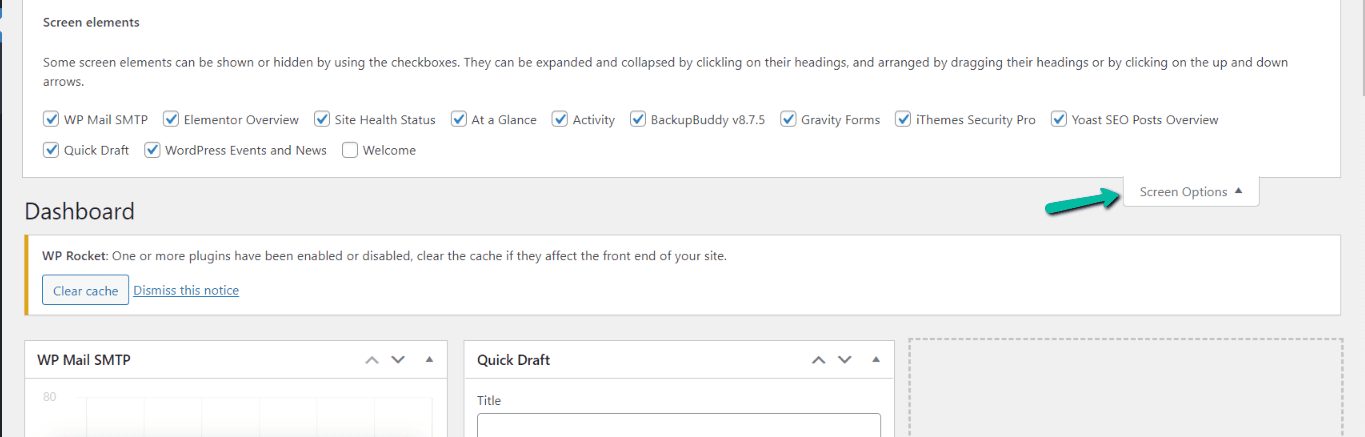 3. Disable unwanted Dashboard Widgets: WordPress by default loads some widgets on the dashboard screen. Widgets like Quick Draft, Events and News, Site Health, At a Glance, Activity and more. Some WordPress plugins also add their own widgets to the dashboard. If you have a lot of these widgets loading on your dashboard, it could bring things down in terms of performance. You can turn off these widgets by simply clicking on the Screen Options button and unchecking the box next to the widgets.